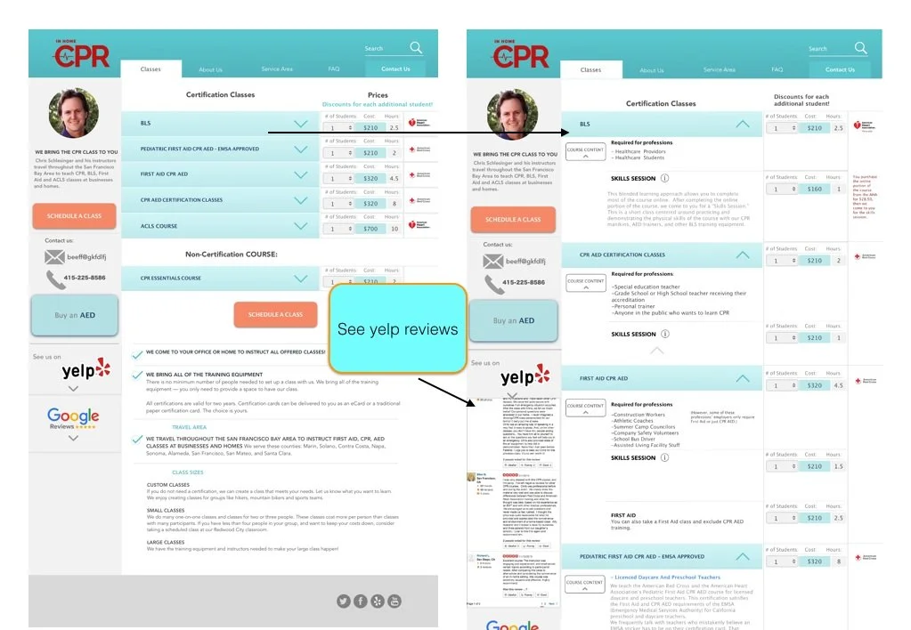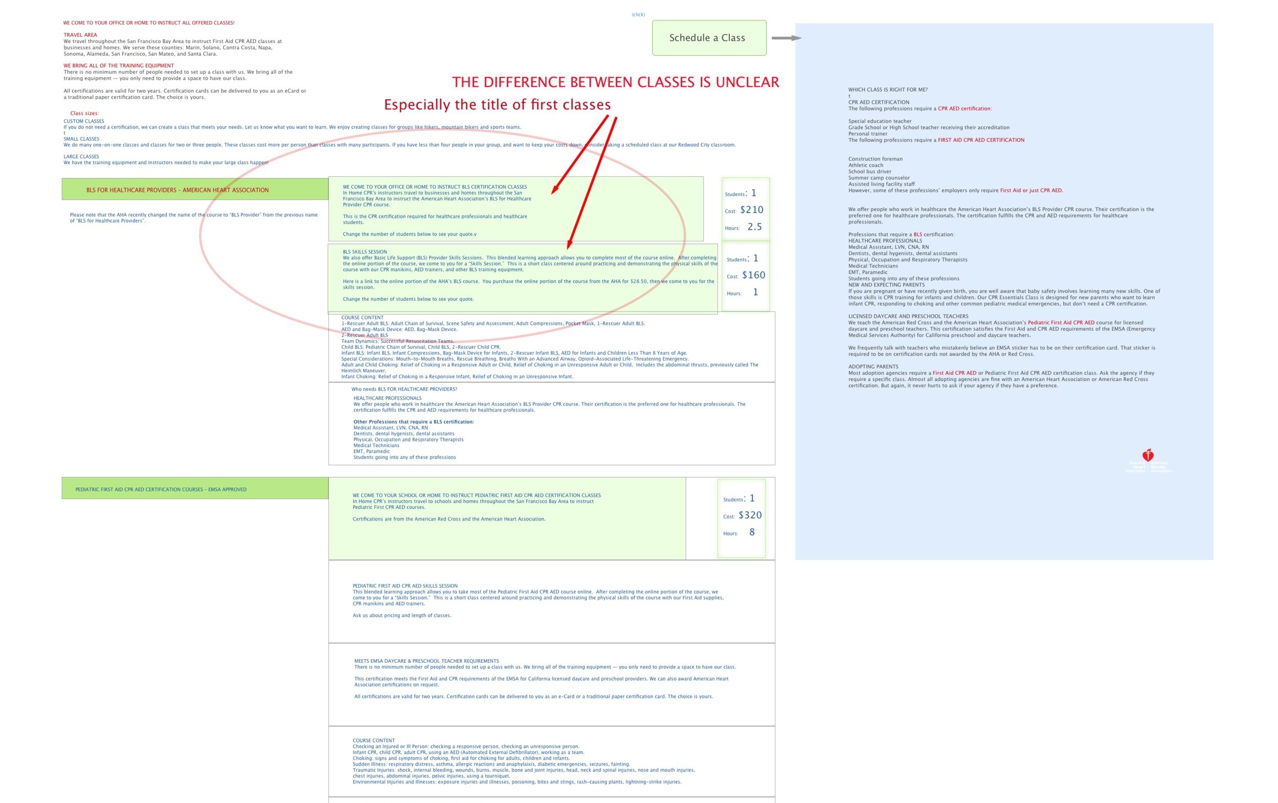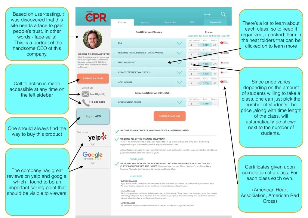 The InHomeCPR website is the major channel for users to gain information about the different types of first aid certificate and non-certificate programs, see the area of service, register for class by contacting company’s representative, and pay for class.. However, the current website has severe usability problems that makes it challenging for visitors to achieve their tasks quickly and accurately. As a result, the conversion rate has dropped drastically since the new (prior to my involvement) redesigned website was launched.
