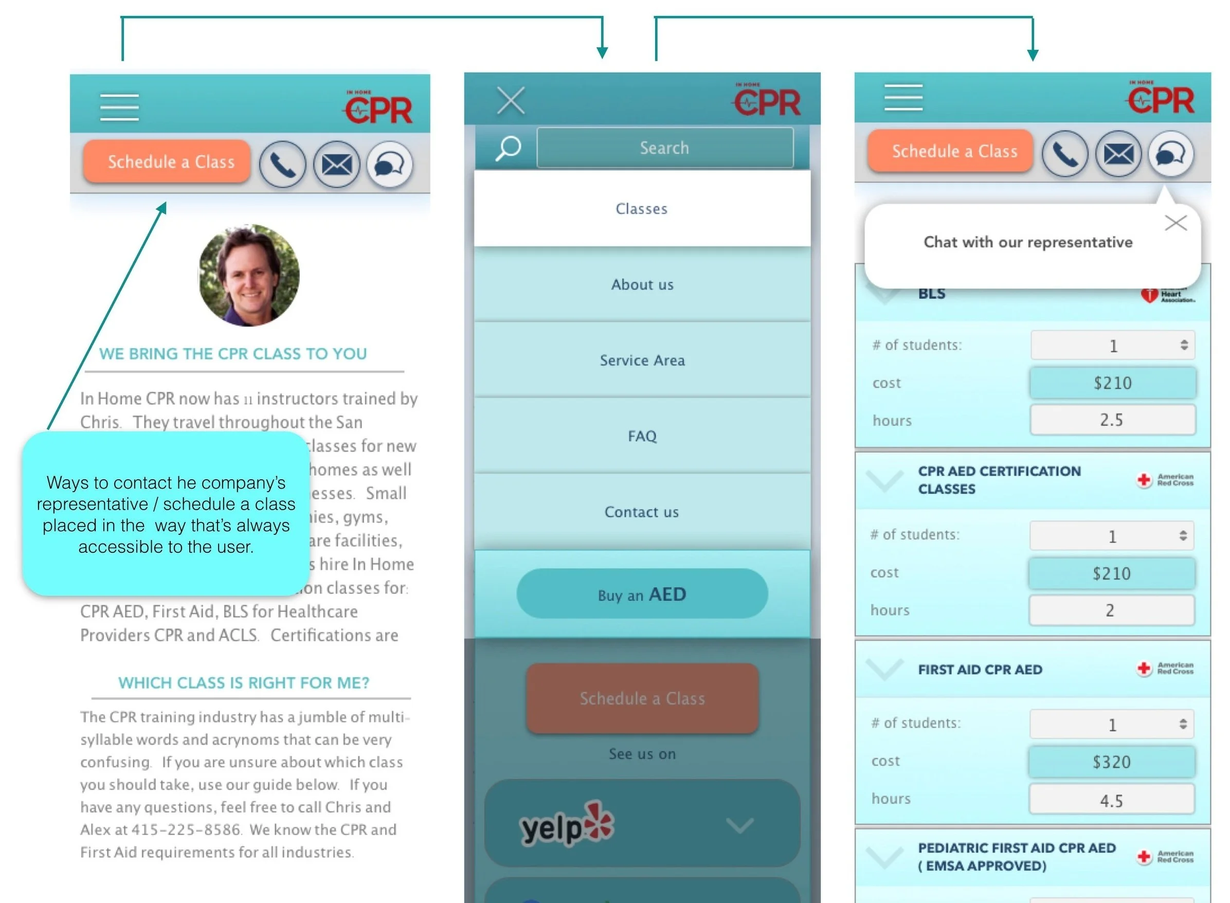 Since majority of InHomeCPR clientele use their phones to look up and schedule classes, creating a mobile version of the prototype was a must.