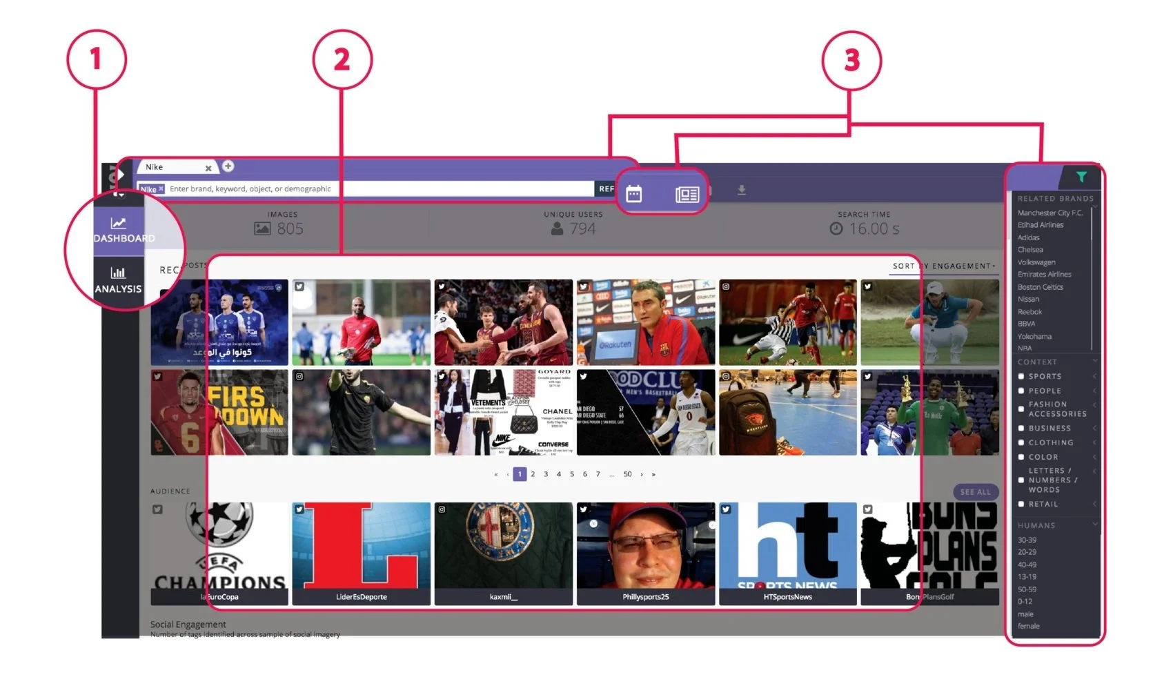 DASHBOARD displays the data about the audience / influencers, aka people who post pictures with a brand on Instagram or/and Twitter.