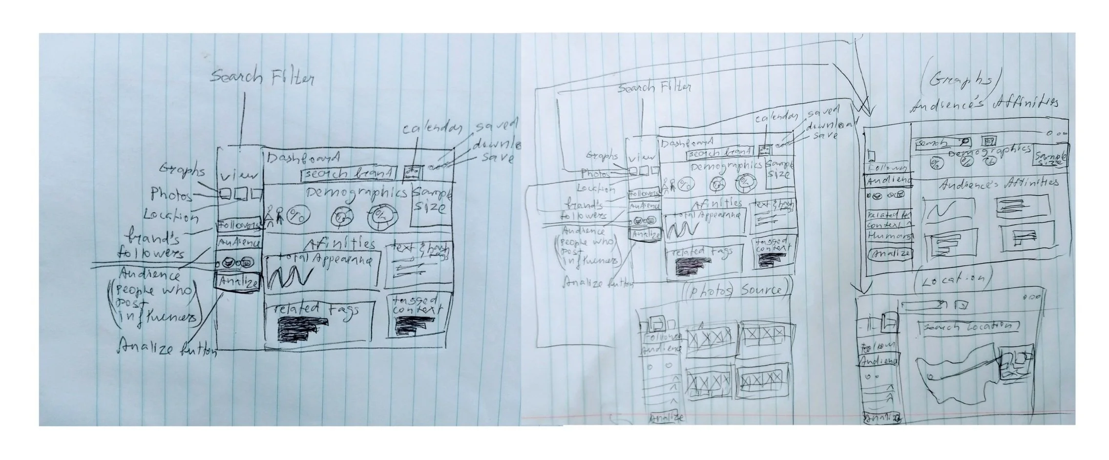 4. As a way to use the dashboard’s real estate wisely, without overloading the page, I separated the source ( pictures and influencers’ profiles) and the data ( extracted from source) into two different pages. For easy navigation through both, I thought It’d be a good idea to have a dashboard view fully adjustable by having them appear as sliding pages. One would be able to view those pages together or separately (by sliding over and hiding the page that’s less relevant)